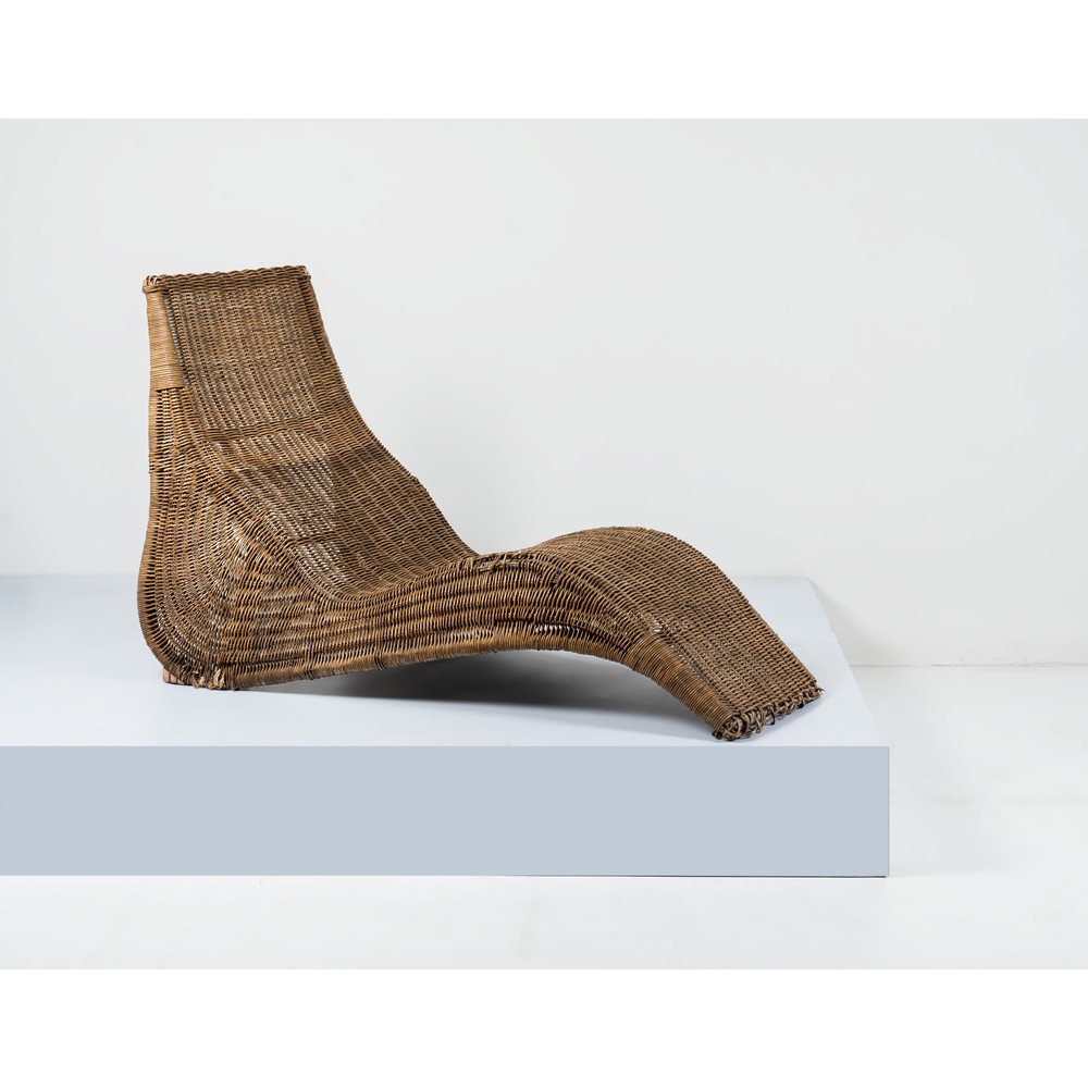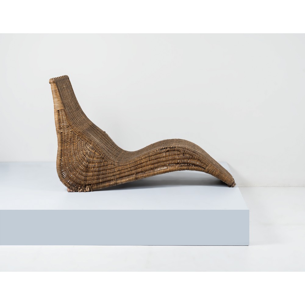 Poltrona lounge modello “Karlskrona” con struttura in canna di bamboo e vimini. Segni di uso e difetti.