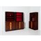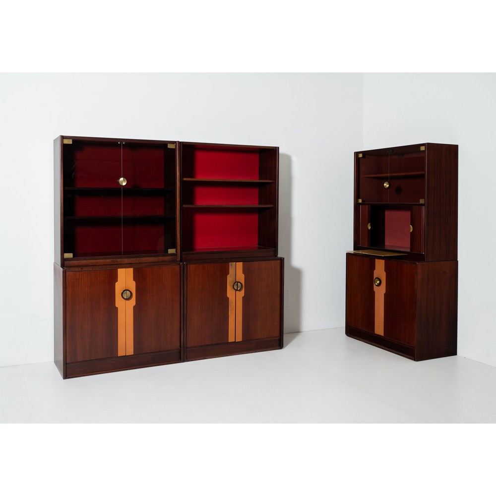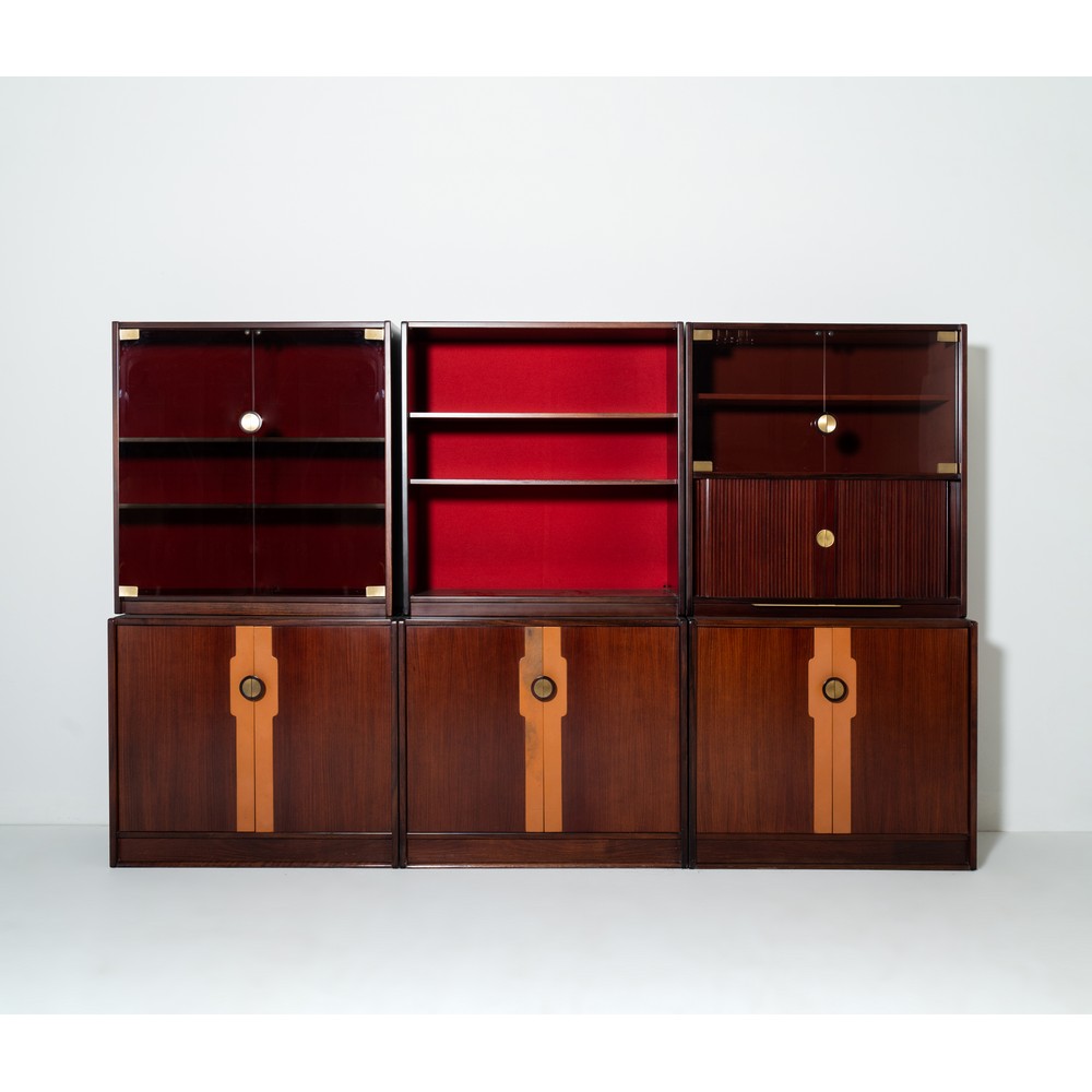 Mobile contenitore alto in legno esotico composto da tre elementi, sul fronte nella parte posteriore ciascuno ha un vano chiuso con due ante battenti decorate con motivo geometrico in pelle marrone, sulla parte superiore un vano chiuso con ante battenti in vetro fumè, un vano con mensole a giorno ed un vano chiuso con ante battenti in vetro fumè con sottostante vano bar chiuso con ante a serranda scorrevole in legno e con ridetto a scomparsa, minuterie in metallo dorato. Segni di uso e difetto alla pelle.