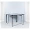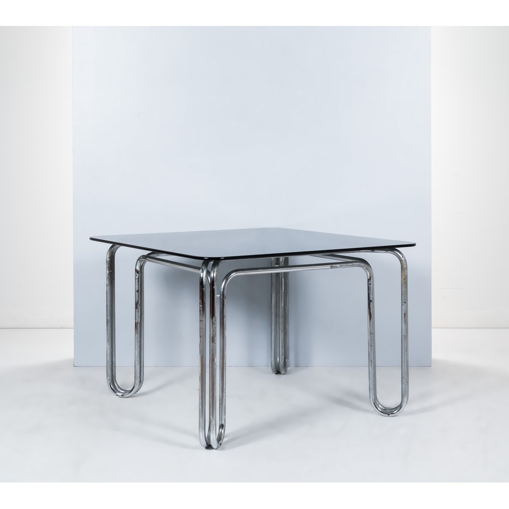 Tavolo da pranzo con struttura in tubolare metallico cromato, piano quadrato in vetro fumè, angoli arrotondati.