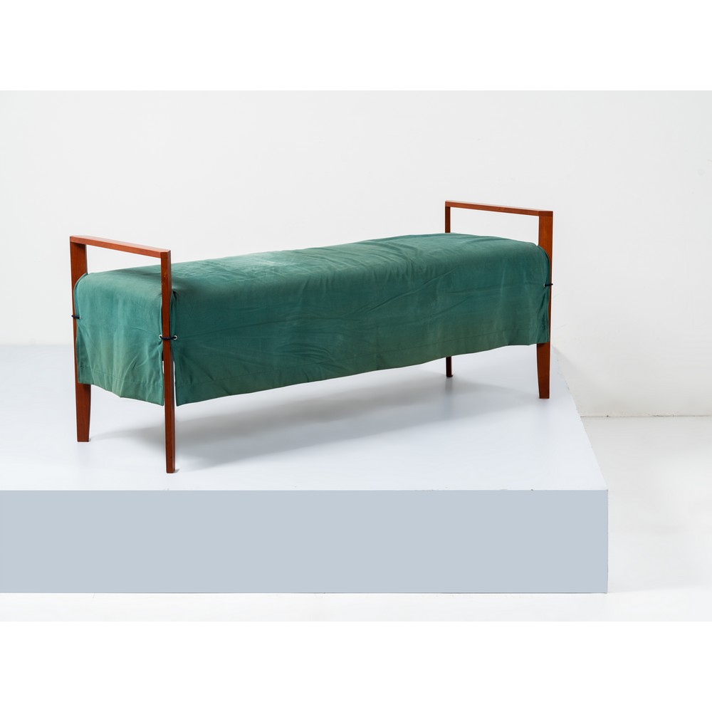 Panca con struttura in legno di ciliegio, seduta con imbottitura, rivestimento sfoderabile in tessuto verde.