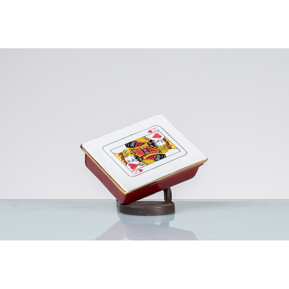 Scatola porta carte da giochi in ceramica smaltata e decorata con figura di re di cuori. Marchio di produzione e numerazione 751.