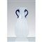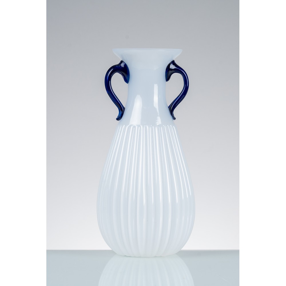 Vaso in vetro opalino, corpo a goccia con decori a costole verticali, collo a vaso con bocca piana circolare, due anse applicate e curvate in vetro blu.