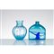 Vaso in vetro azzurrino e decorato con decoro astratto blu, corpo semisferico con basso collo e bocca circolare piana. Etichetta di produzione. Vaso in vetro azzurrino con lavorazione a costole verticali, corpo sferico con collo a vaso e bocca circolare piana. Etichetta di produzione.