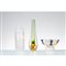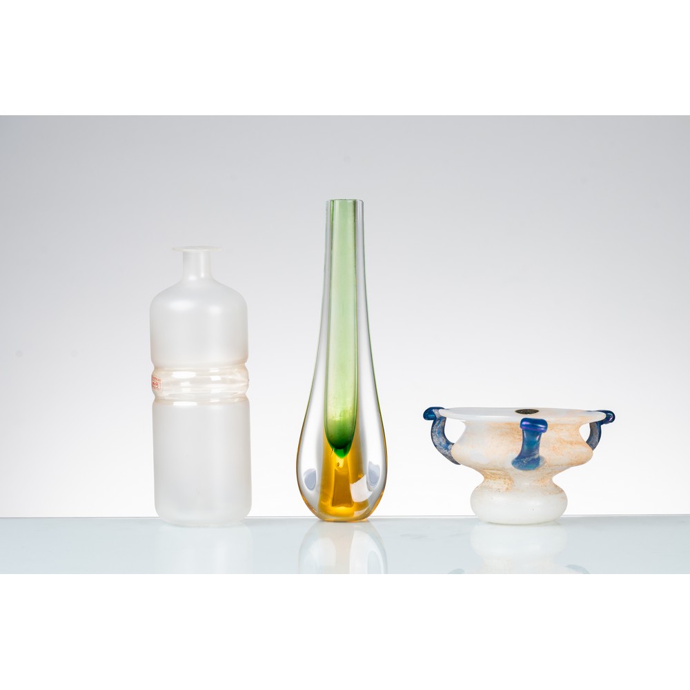 Un vaso Cenedese in vetro scavo bianco opalescente con tre anse blu iridato, etichetta di produzione; una bottiglia Salvadori in vetro trasparente e satinato; un vaso sommerso in vetro verde e giallo, corpo a goccia con bocca ovalizzata, difetto.