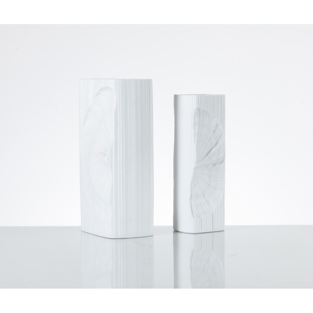 Due vasi della serie “Studio Line” in porcellana bianca a stampo corpo a parallelepipedo con decoro tridimensionale. Marchio di produzione.