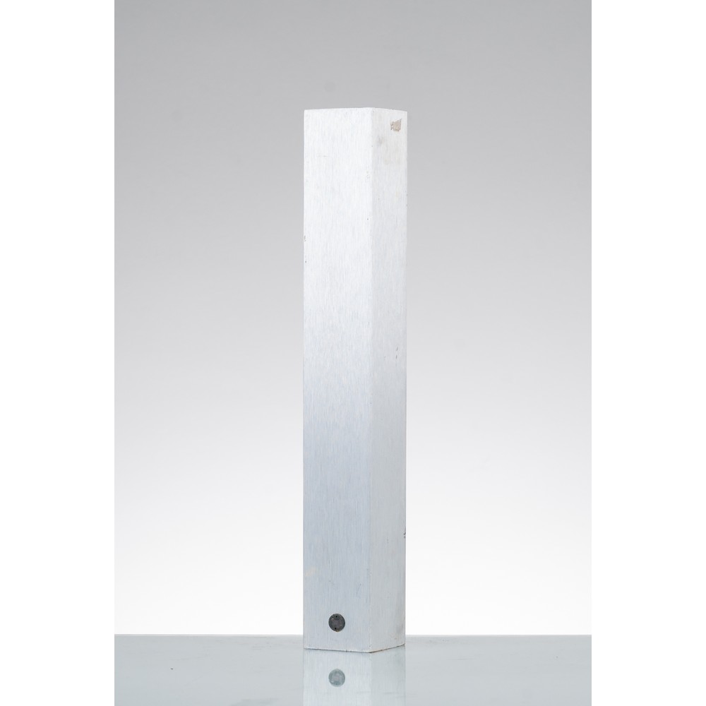 Posacenere da terra modello ‘Ponza’, foglio di alluminio piegato inserito in tubo di metallo a sezione quadrata. Marchio della manifattura sotto la base.