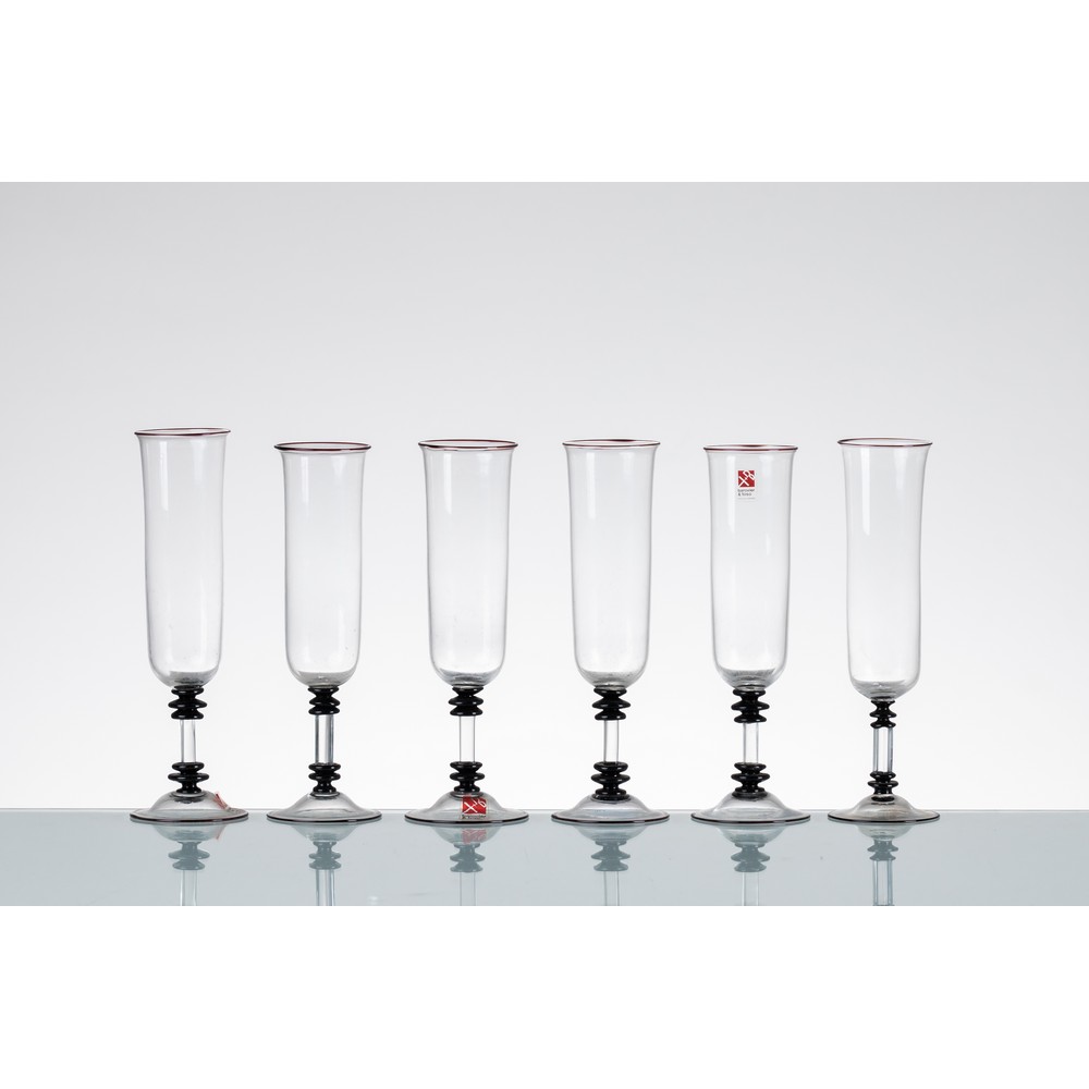 Sei flûtes in vetro incolore trasparente con particolari in vetro nero. Etichetta di produzione.