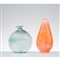 Due vasi in vetro scavo di forma differente uno verde ed uno arancione, quello verde con corpo sferico, basso collo e bocca circolare estroflessa piana; quello arancione con corpo a goccia e bocca circolare piana.
