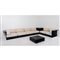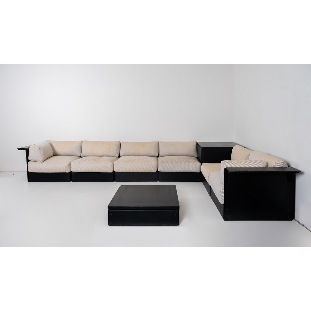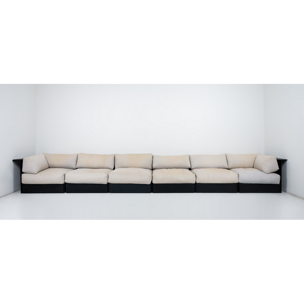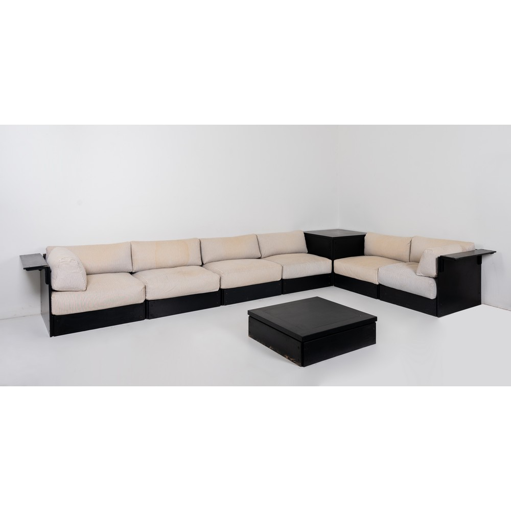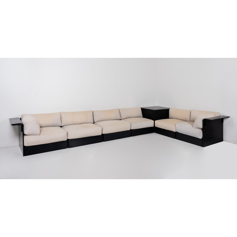 Divano modulare a sei posti con angolo appoggio e tavolo basso, struttura in legno di faggio verniciato nero, cuscini di seduta e spalliera con imbottitura e rivestimento in tessuto avorio e righe grigie. Lievi difetti e macchie. Illustrazione allegata del modello.