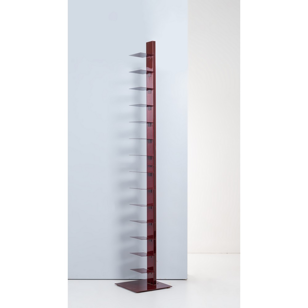 Libreria modello “Sapiens” in metallo laccato bordeaux. Segni di uso.