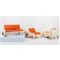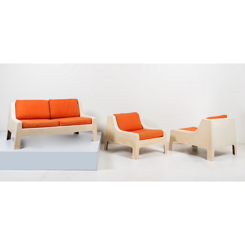 Divano e due poltrone modello ”Mida”, struttura in abs con cuscini di seduta e spalliera imbottiti e rivestiti con tessuto corallo. Segni di uso.