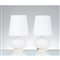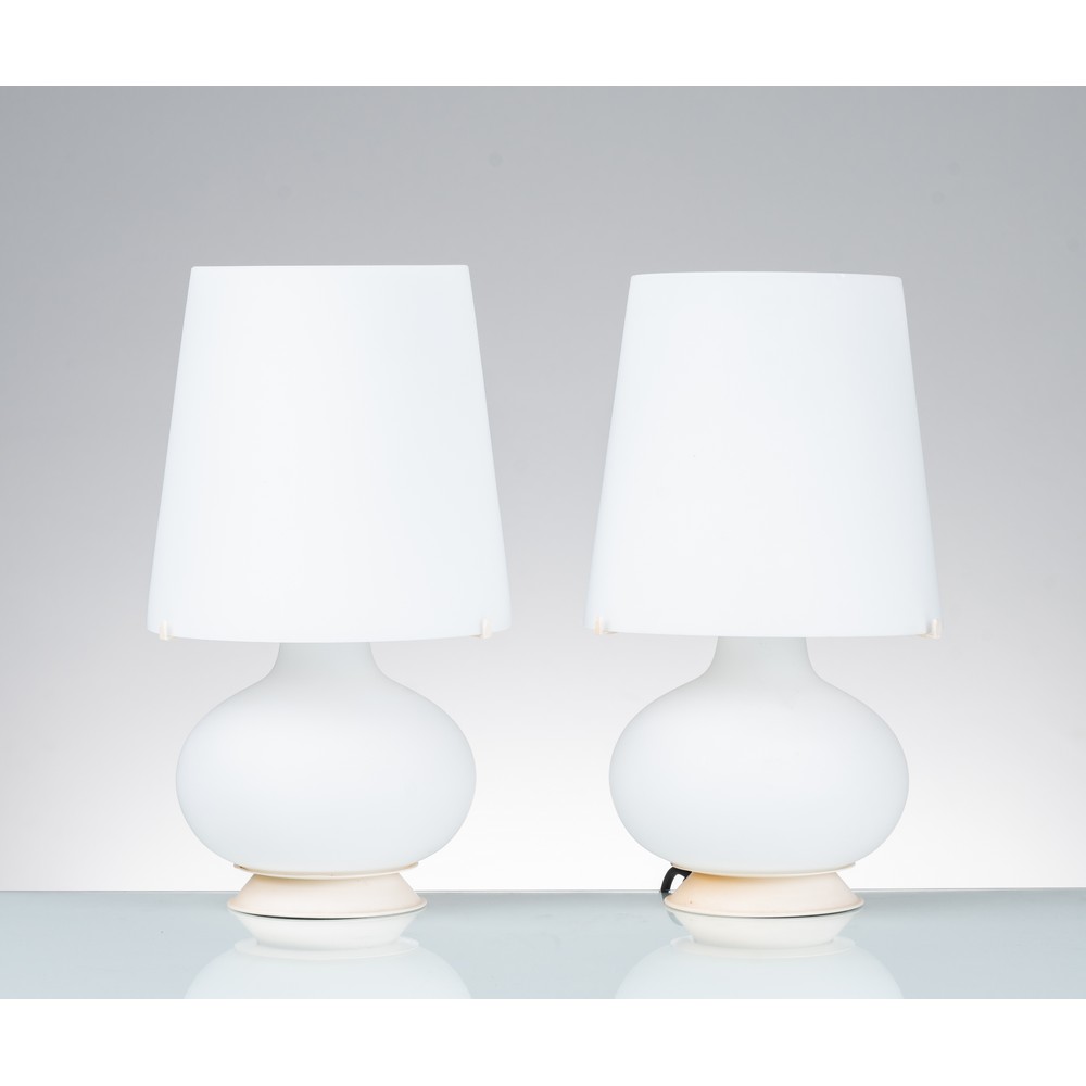 Coppia di lampade da tavolo ad una luce modello “1853”, struttura e diffusore in vetro lattimo satinato, base in metallo laccato. Una sbeccatura sul bordo di un diffusore. Marchio originale.