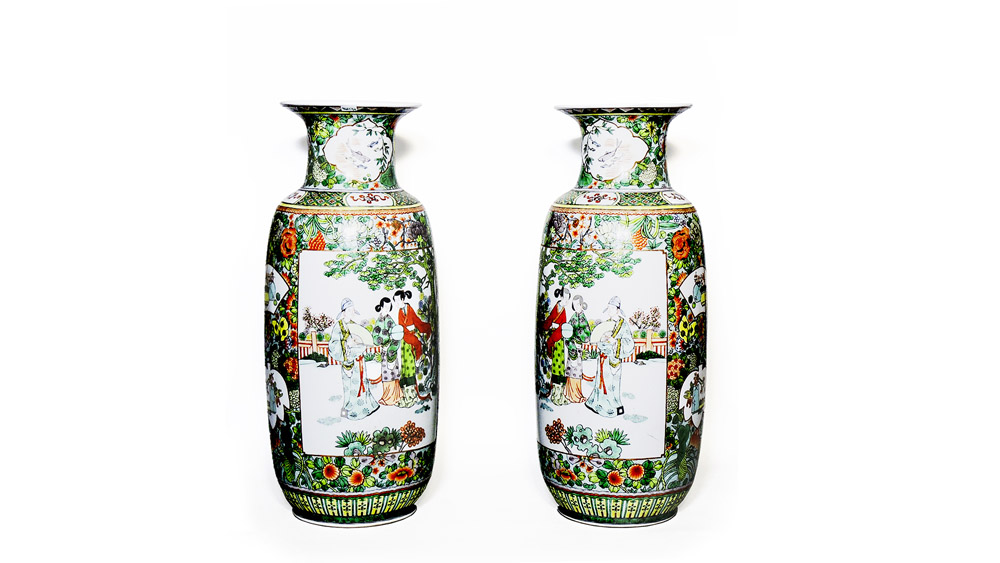 COPPIA DI GRANDI VASI IN PORCELLANA POLICROMA Cina, XX secolo forma a...