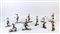 CENTROTAVOLA IN PORCELLANA RAFFIGURANTE SCENA DI CACCIA Nymphenburg, XX secolo composto da sette figure maschili su cavalli bianchi, un cavaliere con cani al guinzaglio, uno con corno ed uno con falcone, lievi difetti h da cm 15 a cm 20 (10) PORCELAIN HUNTING CENTREPIECE GROUP, NYMPHENBURG, 20TH CENTURY