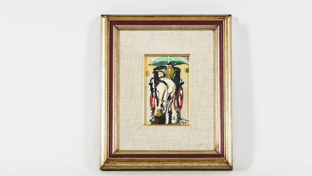 RODOLFO MARMA (1923-1999) Carrozzella 1971 olio su tavoletta, firmato e datato, al verso firmato, datato e titolato, in cornice cm 15x10 HORSE-DRAWN CARRIAGE, OIL ON PANEL