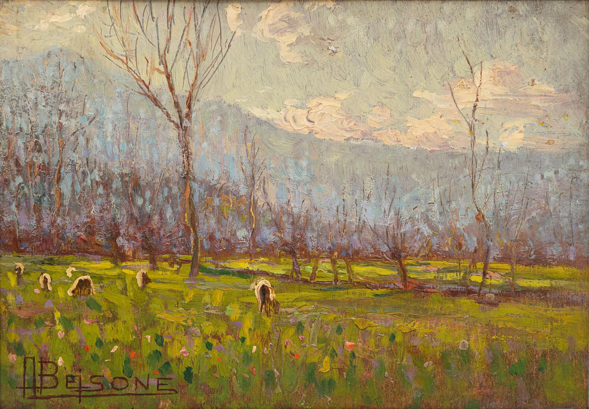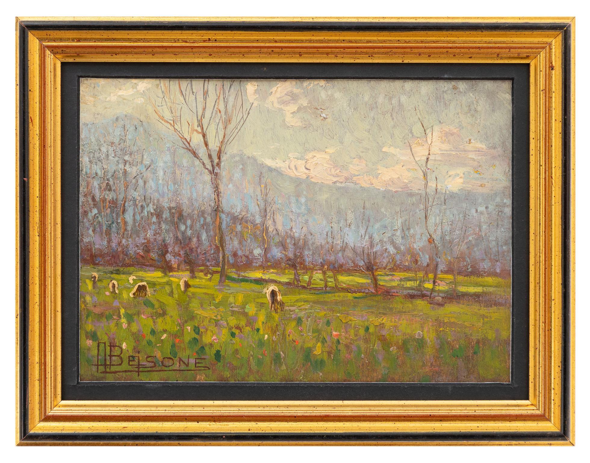 - Alfredo Beisone è stato un pittore italiano del Novecento, la cui vita e carriera riflettono un profondo legame tra arte e territorio. Nato a Pinerolo il 17 ottobre 1882 e scomparso a Torino il 12 gennaio 1957, fin da giovane scelse la pittura, abbandonando gli studi di Farmacia per dedicarsi alla sua vera passione. Durante la sua formazione incontrò Lorenzo Delleani e divenne allievo del maestro Andrea Tavernier, esperienza che lo avvicinò al divisionismo e lo portò a esplorare nuovi linguaggi espressivi.Il suo esordio avvenne nel 1913, con l’opera "Armonie invernali" presentata alla Società Promotrice di Torino, segnando l’inizio di una carriera costellata da numerose esposizioni in città come Torino, Genova e Roma. Tra le tappe fondamentali della sua attività espositiva si annoverano la Quadriennale di Torino e la Mostra Nazionale di Trieste, con la sua prima mostra personale a Pinerolo nel 1932 che vide l’esposizione di 41 opere.Oltre alla carriera artistica, Beisone si distinse anche per il suo impegno civile. Durante la Prima Guerra Mondiale si arruolò come volontario alpino, distinguendosi per il coraggio dimostrato e ricevendo medaglie al valore militare. Negli anni Trenta, oltre a portare avanti la sua attività pittorica, assunse un ruolo attivo nella vita pubblica del Comune di Pinerolo, venendo insignito della Croce di Cavaliere della Corona nel 1931.Artisticamente, Beisone si distinse come un autentico paesaggista. Le sue opere, spesso realizzate all’aperto, catturano con delicatezza e intensità la bellezza della natura: dalle case e i campanili dei piccoli borghi alle ampie distese di colline, montagne e prati illuminate dalla luce del sole. Con un linguaggio pittorico personale, il pittore ha saputo trasmettere emozioni e sensazioni, creando immagini che rimangono impresse nella memoria di chi le osserva.La storia di Alfredo Beisone testimonia il percorso di un artista che ha saputo unire tecnica, passione e impegno civile, lasciando un’eredità preziosa che continua a illuminare il panorama dell’arte italiana.