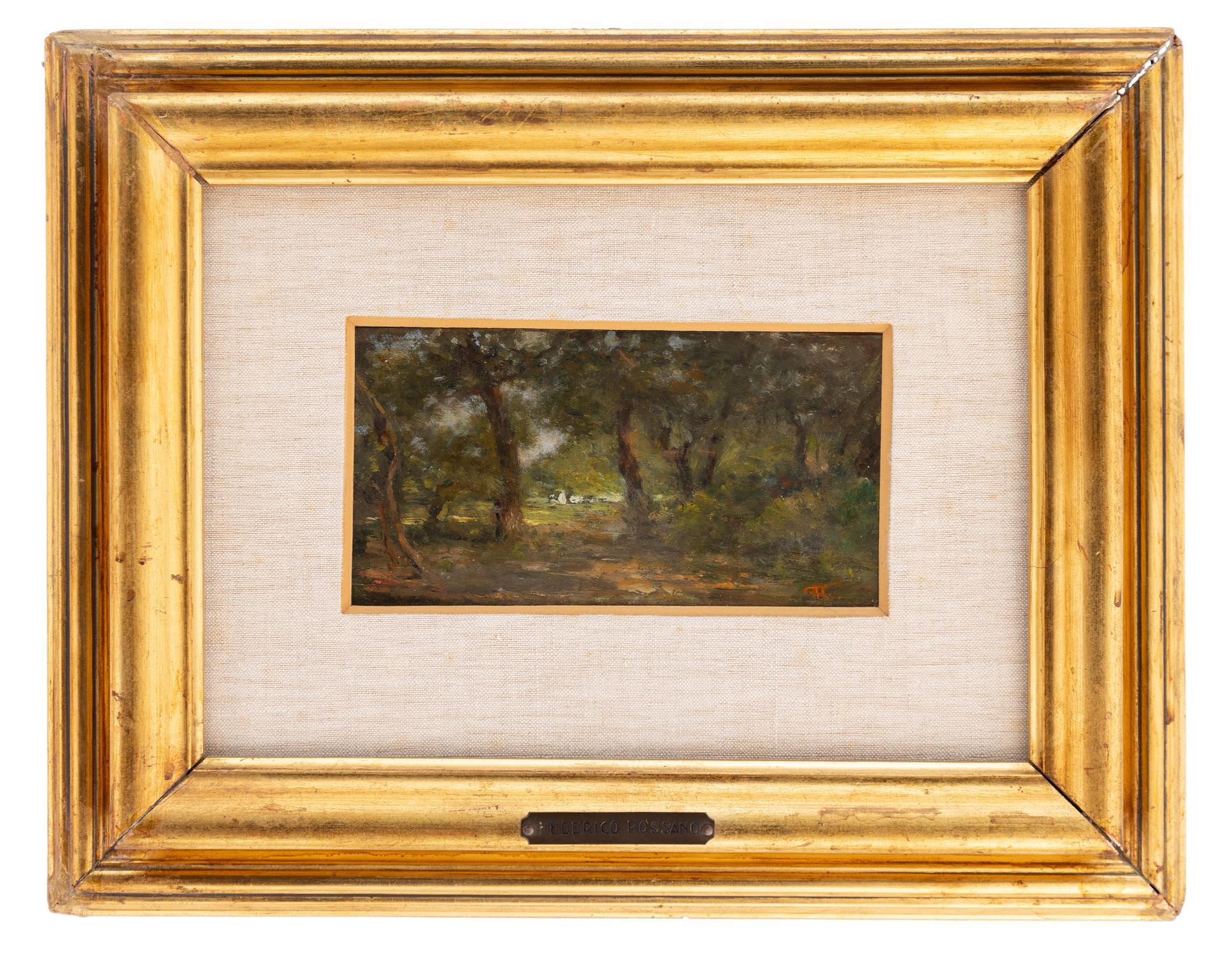 - Federico Rossano nacque a Napoli il 31 agosto 1835, da Vincenzo e Elisabetta. Fin da giovane si iscrisse al Reale Istituto di Belle Arti di Napoli, inizialmente per frequentare la scuola di architettura, ma ben presto indirizzò il suo interesse verso la pittura, contro la volontà paterna.Durante la sua formazione venne influenzato da maestri quali Giacinto Gigante e Filippo Palizzi, figure di spicco del paesaggismo napoletano, e coltivò una vocazione al paesaggio che lo avrebbe accompagnato per tutta la vita. Nei primi anni Sessanta partecipò a importanti esposizioni in Italia, entrando in contatto con un ambiente pittorico in fermento.Intorno al 1858 si trasferì a Portici (o comunque alla zona della Villa Favorita nei pressi di Napoli) dove si aggregò, insieme ad artisti come Marco De Gregorio, Giuseppe De Nittis e Adriano Cecioni, al gruppo che passò alla storia come la cosiddetta “Scuola di Resìna”. In questo contesto Rossano partecipò all’elaborazione di un’idea di paesaggio più reale, spontanea e “per macchie”, denunciando l’eccessiva finitura e accademismo della pittura tradizionale.Nel 1872 prese parte all’Esposizione di belle arti di Milano; un anno dopo vinse una medaglia di seconda classe all’Esposizione universale di Vienna. A partire dalla metà degli anni Settanta si trasferì a Parigi, grazie anche all’invito di De Nittis, dove rimase per circa vent’anni. In Francia ampliò i suoi orizzonti pittorici: si fece influenzare dalla pittura della scuola di Barbizon e dall’impressionismo nascente, pur mantenendo un approccio personale e non del tutto imitatore. I suoi paesaggi parigini e delle campagne francesi sono caratterizzati da una resa luminosa e atmosferica, dove la natura sembra avvolta da una luce sognante piuttosto che descritta in modo minuzioso.Nel 1880 sposò Zélie Brocheton, figlia di un notaio di Soissons, stabilendo così un legame affettivo e personale che lo ancorò alla Francia. Tuttavia, dopo circa vent’anni di permanenza parigina, Rossano fece ritorno in Italia intorno al 1893, stabilendosi a Portici e successivamente a Napoli. Qui ottenne, per interessamento del pittore Domenico Morelli, la cattedra di paesaggio alla Regia Accademia di Belle Arti di Napoli, incarico che ricoprì con continuità. Partecipò anche a manifestazioni come la Biennale di Venezia (nel 1899, 1905, 1910).Artisticamente, Rossano si distingue per la sua fusione tra realismo verista e sensibilità luministica. Le sue opere paesaggistiche non puntano alla mera cronaca ma a cogliere l’atmosfera: la luce che pervade un campo, i riflessi sull’acqua, il taglio del cielo al tramonto. Pur dentro l’orizzonte della Scuola di Resìna, Rossano non aderì alla vita mondana o urbana con l’intensità dei suoi contemporanei: la sua scelta fu più contemplativa, legata alla natura e all’ambiente più quieto.Federico Rossano morì a Napoli il 15 maggio 1912. - Federico Rossano nacque a Napoli il 31 agosto 1835, figlio di Vincenzo Rossano ed Elisabetta Guisini. Sin da giovane, la sua inclinazione verso l’arte lo portò a intraprendere gli studi presso la Reale Accademia di Belle Arti di Napoli, inizialmente orientandosi verso l'architettura per seguire le aspettative paterne. Tuttavia, la sua passione per la pittura lo portò a cambiare indirizzo e a studiare sotto la guida dei maestri Giacinto Gigante e Gennaro Ruo. La sua formazione si arricchì ulteriormente grazie alla scelta di studiare direttamente la natura, una scelta che lo portò a lasciare l’Accademia per dedicarsi autonomamente alla pittura.Nel 1858, Rossano si trasferì a Portici, dove grazie all'invito del pittore Marco De Gregorio, allestì il suo studio nel Palazzo Reale. Qui entrò in contatto con altri artisti che avrebbero avuto un'importante influenza sulla sua carriera, come Giuseppe De Nittis e Adriano Cecioni. Insieme, fondarono la “Scuola di Resina”, un gruppo che si ispirava ai principi veristi e ai macchiaioli, con l'intento di rappresentare la realtà e la luce naturale in modo autentico.La sua carriera artistica decollò nel 1862, quando espose alla Promotrice di Napoli, e proseguì con partecipazioni a mostre prestigiose come la Promotrice “Salvator Rosa” di Napoli e l'Esposizione Nazionale di Firenze nel 1861. La sua arte, caratterizzata da delicate trasparenze e una tavolozza armoniosa, gli valse riconoscimenti sia in Italia che all'estero. Nel 1873, espose a Vienna, ottenendo un premio, e partecipò al Salon di Parigi nel 1876 con opere come “I covoni”.Nel 1876, Rossano si trasferì a Parigi, dove rimase per circa venti anni. Lì, fu profondamente influenzato dalla pittura impressionista e dalla Scuola di Barbizon, sviluppando uno stile che combinava pennellate fluide e luminose con atmosfere malinconiche. Nel 1880, sposò Zelye Brocheton, figlia di un notaio di Soissons. Questo periodo parigino segnò un importante capitolo della sua carriera, durante il quale consolidò la sua reputazione in Europa.Nel 1893, Rossano tornò a Portici, dove le difficoltà economiche lo spinsero ad accettare un incarico come insegnante di paesaggio presso la Reale Accademia del Disegno di Napoli, posizione che mantenne fino al 1902. Continuò a partecipare alle Biennali di Venezia, dove espose nel 1899, 1905 e 1910, consolidando ulteriormente la sua fama. La sua arte continuò a essere apprezzata, e sue opere vennero acquisite da importanti collezioni pubbliche, come quella della Galleria di Capodimonte e della Galleria d'Arte Moderna di Roma.Federico Rossano morì a Napoli il 15 maggio 1912, lasciando un’importante eredità artistica. Le sue opere sono oggi conservate in diverse collezioni, a testimonianza del suo contributo fondamentale alla pittura italiana.