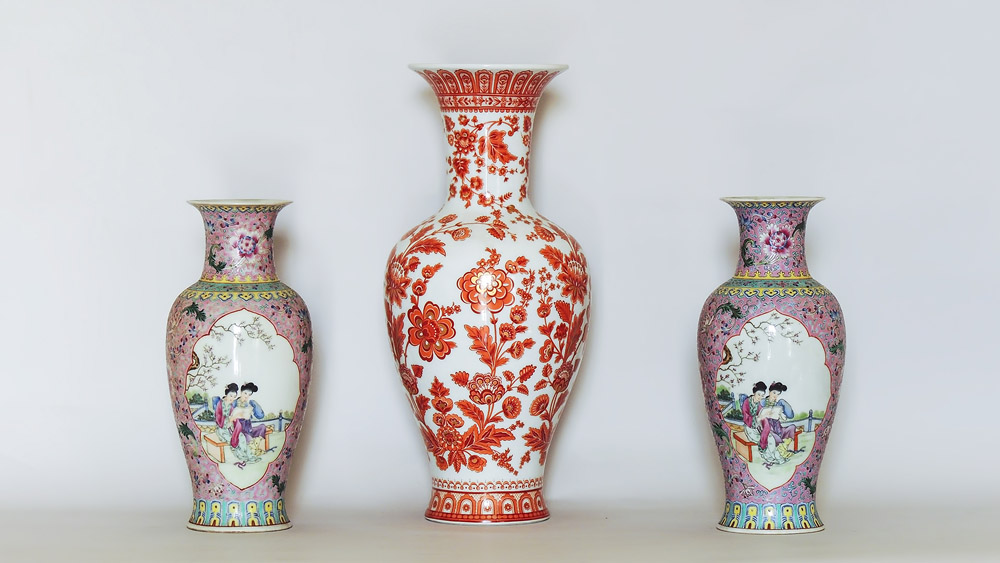 TRE VASI IN PORCELLANA CINESE una coppia con figure femminili dipinte su...