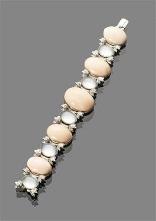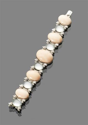 BRACCIALE Bracciale in oro bianco con coralli rosa e claire de lune taglio cabochon intervallati da barrette in oro bianco con diamanti taglio brillante per complessivi ct 0,75 ca. peso gr 75,30 white gold bracelet with rose coral and claire de lune cabochons spaced with white gold and brillant cut diamonds approx total 0,75 gr
