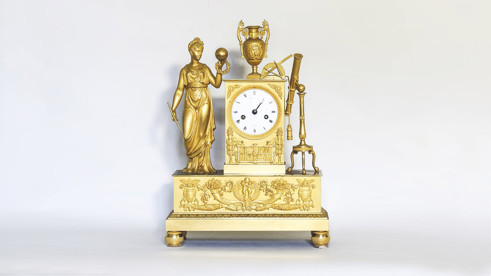 OROLOGIO DA TAVOLO IN BRONZO DORATO Parigi, Francois Allamand, prima metà del XIX secolo sormontato da figura femminile in vesti classiche circondata da strumenti scientifici raffigurante Allegoria della Scienza, quadrante firmato in smalto bianco con numeri romani, base a plinto decorata con cornucopie, vasi e putti a bassorilievo, piedini a palla, funzionante, da revisionare h cm 39x28x10 GILDED BRONZE TABLE CLOCK, PARIS, FRANÇOIS ALLAMAND, FIRST HALF OF 19TH CENTURY