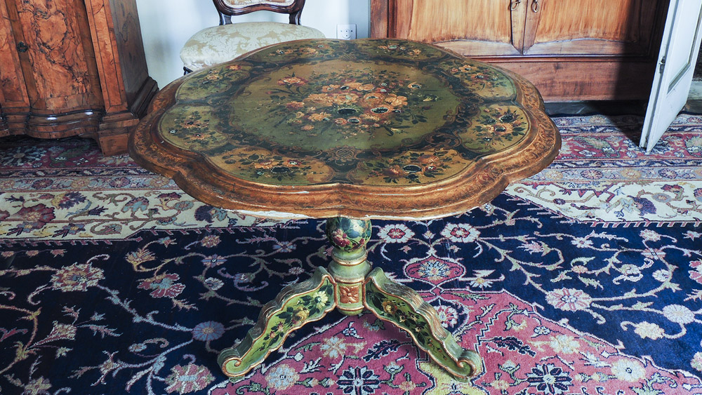 TAVOLINO A VELA IN LEGNO LACCATO inizio del XX secolo piano rotondo lobato, sostegno centrale su tripode, interamente dipinto con motivi floreali policromi, applicazioni in madreperla e lumeggiato in oro, alcuni difetti h cm 90, diam cm 66 Painted Softwood Tilt-top Table, early 20th Century