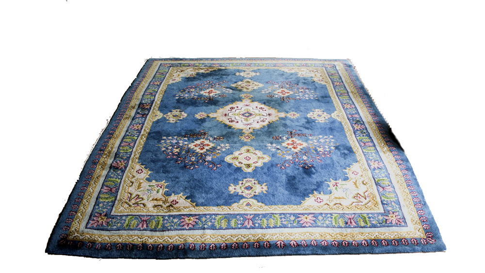 TAPPETO PERSIANO DI VECCHIA MANIFATTURA fondo blu, campo con medaglione centrale e motivi floreali stilizzati nei toni del rosso, verde e giallo cm 398x296 PERSIAN CARPET