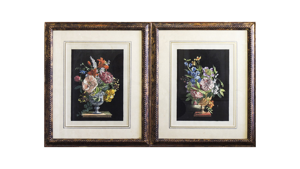 VASI CON FIORI coppia di litografie acquerellate, in cornice, cm 29x21 FLOWERS IN A VASE, A PAIR OF WATERCOLOURED PRINTS