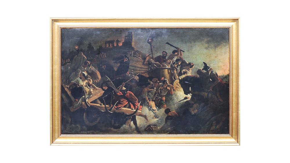 SCENA STORICA CON BATTAGLIA E CITTÀ IN FIAMME SULLO SFONDO XIX secolo olio su tela, in cornice cm 91x60 HISTORICAL SCENE WITH BATTLE AND FIRE IN THE CITY ON THE BACKGROUND, 19TH CENTURY, OIL ON CANVAS