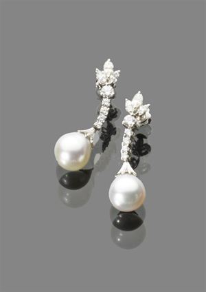 COPPIA DI ORECCHINI Coppia di orecchini in oro bianco con due perle South Sea a goccia diametro 12 e diamanti di vari tagli per complessivi ct. 2,10, colore G/H, purezza IF/WS. Peso g.11,20 pair of white gold earrings with 2 teardrop 12 mm south sea pearls and various size diamonds approx total 2,10 kt color G/M clarity IF/WS weight 11,20 gr