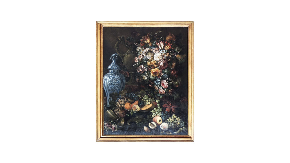 NATURA MORTA CON FRUTTA, FIORI E VASO CINESE fine del XIX secolo olio su tela, in cornice cm 115x85 STILL LIFE WITH FRUITS AND CHINESE VASE, LATE 19TH CENTURY, OIL ON CANVAS