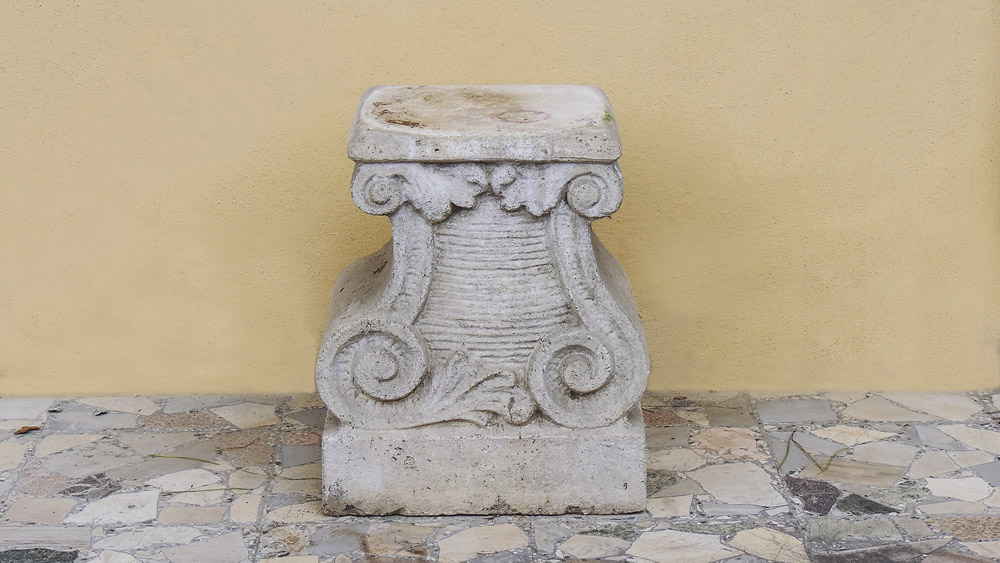 CAPITELLO DA GIARDINO decorato con volute contrapposte e motivi vegetali h cm 43x36x26 GARDEN CAPITAL BASIS