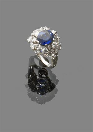 ANELLO Anello in oro bianco con zaffiro Burma taglio ovale di ct 4,13 contornato da diamanti taglio brillante e taglio marquise per complessivi ct 4,37 ca peso gr 12,10 White gold ring with 4.13 kt oval Burma sapphire srrounded by brilliant cut and marquise-cut diamonds approx total 4,37 kt weight 12.10 gr