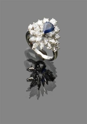 ANELLO Anello in oro bianco con zaffiro a forma di goccia di ct 1,40 ca contornato da diamanti taglio brillante e taglio marquise per complessivi ct 2,12 ca peso gr 8,40 white gold ring with 1,40 kt tear drop shaped sapphire surrounded by brillant and marquise cut diamonds approx total 2.12 kt weight 8,40 gr