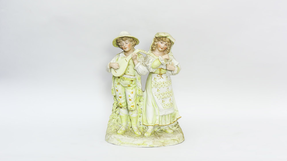 GRUPPO IN BISCUIT dipinto nei toni pastello, raffigurante due contadinelli,...