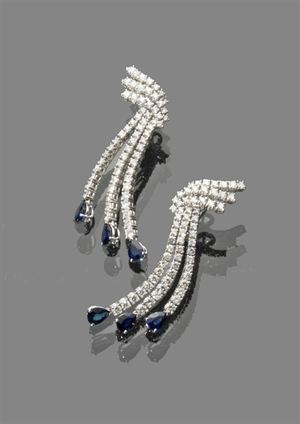 COPPIA DI ORECCHINI Coppia di orecchini in oro bianco con 6 zaffiri a goccia per complessivi ct. 4,50 ca e diamanti taglio brillante per un totale di ct. 6,20 ca, peso gr. 22 white gold earrigns with 6 teardrop shaped sapphires approx total 4,50 kt and brillant cut diamonds approx tot 6,20 kt weight 22 gr