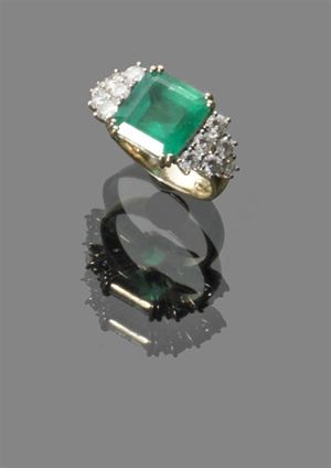 ANELLO Anello in oro bianco con smeraldo di ct 6,80 ca. e ai lati 12 diamanti taglio brillante per complessivi ct 1,20 ca peso gr 9,10 white gold ring with 6,80 kt center emerald sided by 12 brillant cut diamonds approx total 1,20 kt weight 9.10 gr