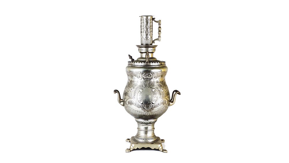 GRANDE SAMOVAR IN METALLO inizio del XX secolo sbalzato con volute e motivi...