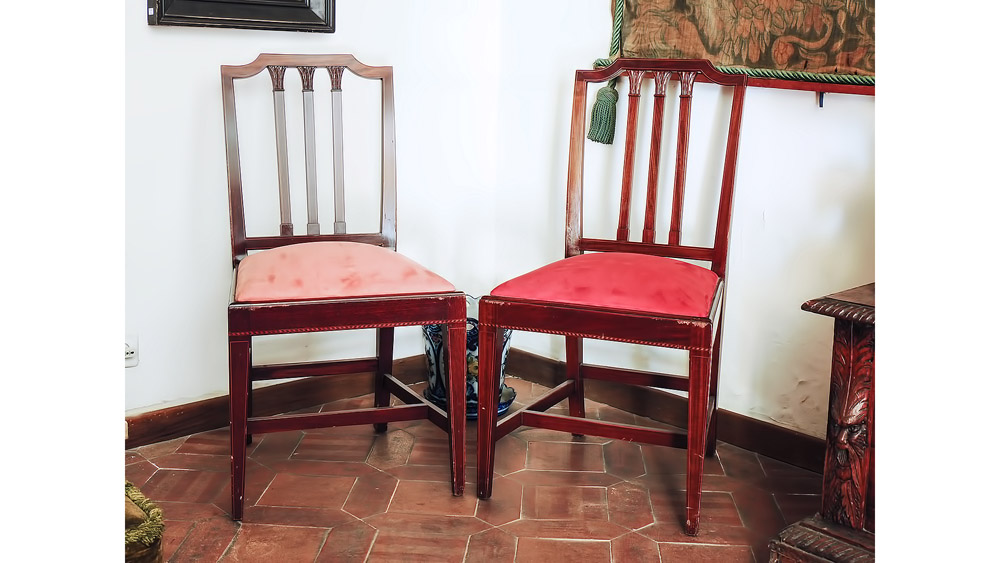 SERIE DI DIECI SEDIE IN MOGANO Inghilterra, inizio del XX secolo intarsiate con filettature in legni di frutto, schienale sagomato, cartella traforata con lesene corinzie, gambe anteriori a faretra, le posteriori a sciabola, riunite da traverse, sedute imbottite e rivestite in differenti tessuti, lievi difetti A SET OF TEN MAHOGANY CHAIRS, ENGLAND, EARLY 20TH CENTURY