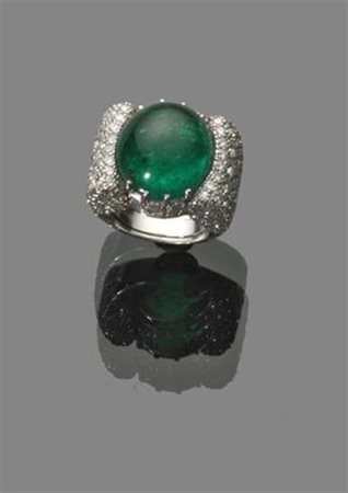 ANELLO Anello in oro bianco con al centro smeraldo taglio cabochon di ct 24,00 ca. con ai lati diamanti di taglio baguette e pavè di diamanti taglio rotondo per complessivi ct 6,00 ca. peso gr 24,00 white gold ring with 24 kt cabochon cut center emerald with pavé and baguette shaped diamonds approx total 6,00 kt weight 24 gr