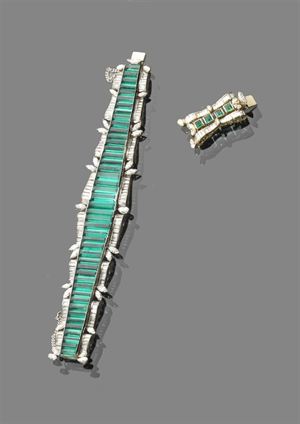 BRACCIALE Bracciale in oro bianco con incastonati 44 smeraldi a baguettes e diamanti taglio trapezio e taglio navette con chiusura movibile composta da 4 smeraldi taglio carrè e diamanti taglio trapezio, goccia e navette. lungh. bracciale cm.16,70 e lunghezza chiusura movibile cm.3,50 peso gr 90,40 white gold bracelet with 44 baguette shaped emeralds and trapezoid shaped diamonds. Moveable closure made up of 4 asccher cut emeralds, trapezoid and drop shaped diamonds. length bracelet: 16,70 cm lenght mouveable closure: 3,50 cm weight 90,40 gr