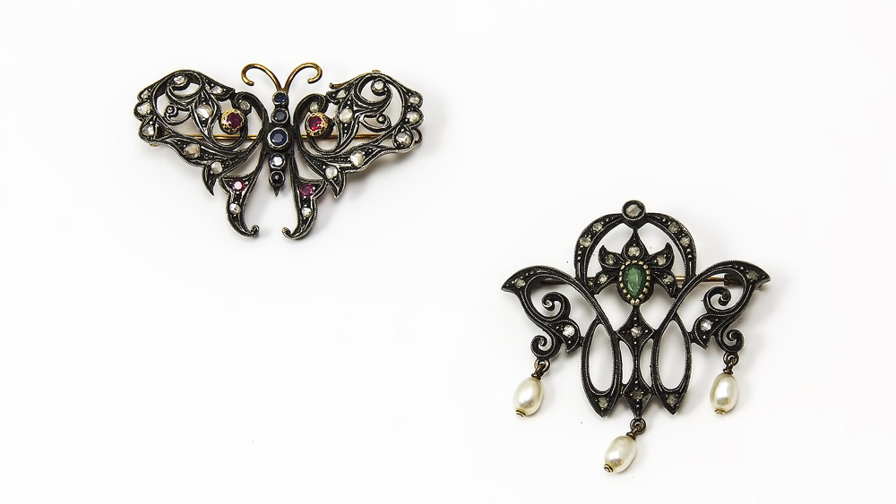 DUE SPILLE IN ORO, ARGENTO, PIETRE COLORATE E PERLE DI ACQUA DOLCE realizzate in stile liberty come farfalle oro 585/1000, gr 18,6 TWO COLORED STONES, SILVER AND YELLOW GOLD BUTTERFLY-SHAPED LIBERTY STYLE BROOCHES