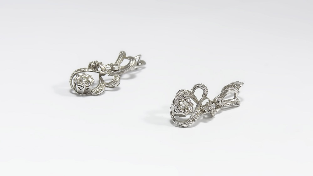 PAIO DI ORECCHINI IN ORO BIANCO E DIAMANTI con pendenti realizzati come volute impreziosite da piccoli brillanti gr 8,6 PAIR OF GOLD AND DIAMOND EARRINGS