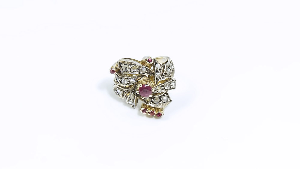 ANELLO IN ORO GIALLO, ARGENTO, CORINDONI VARIANTE RUBINO E DIAMANTI realizzato in stile antico gr 7,3 OLD STYLE RUBIES AND DIAMONDS YELLOW GOLD AND SILVER RING