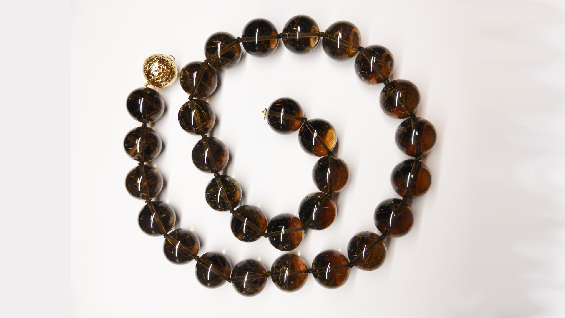 FILO IN QUARZO FUMÉ RUTILATO fermezza in argento dorato lung cm 60, diam mm 20, gr 335 BIG SIZE RUTILATED SMOKY QUARTZ STRAND WITH GOLD PLATED CLASP