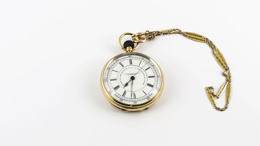 OROLOGIO DA TASCA IN ORO GIALLO J. Hargreaves & C. Liverpool, fine del XIX/inizio del XX secolo quadrante in smalto bianco con numeri romani, corredato da catena in oro giallo diam cm 5, gr complessivi 131 END 19TH/BEGINNING 20TH CENTURY J. HARGRAVES & C. LIVERPOOL, MAKERS TO THE QUEEN AND THE PRINCE OF WALES, YELLOW GOLD POCKET WATCH, WHITE DIAL WITH ROMAN NUMERALS, WITH YELLOW GOLD CHAIN