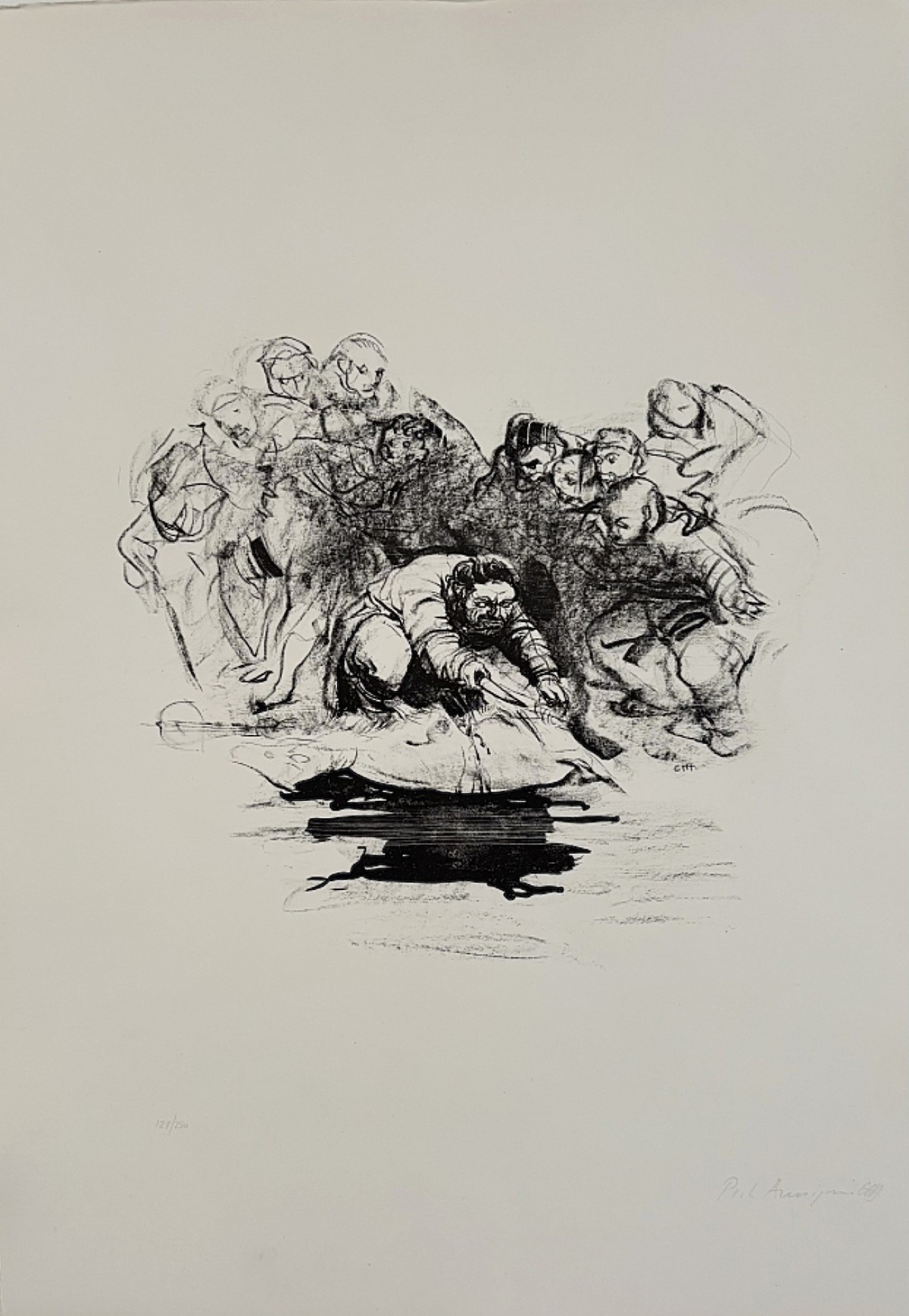 ANNIGONI PIETRO Milano 1910 - Firenze 1988 "Senza titolo" Litografia originale su cartoncino pesante Edizioni Eldec, cm 50x70 del 1981. Firma e timbro a secco sul fronte in basso a destra, tiratura 127/250 a sinistra. Opera creata per illustrare il libro "La follia di Erasmo da Rotterdam".