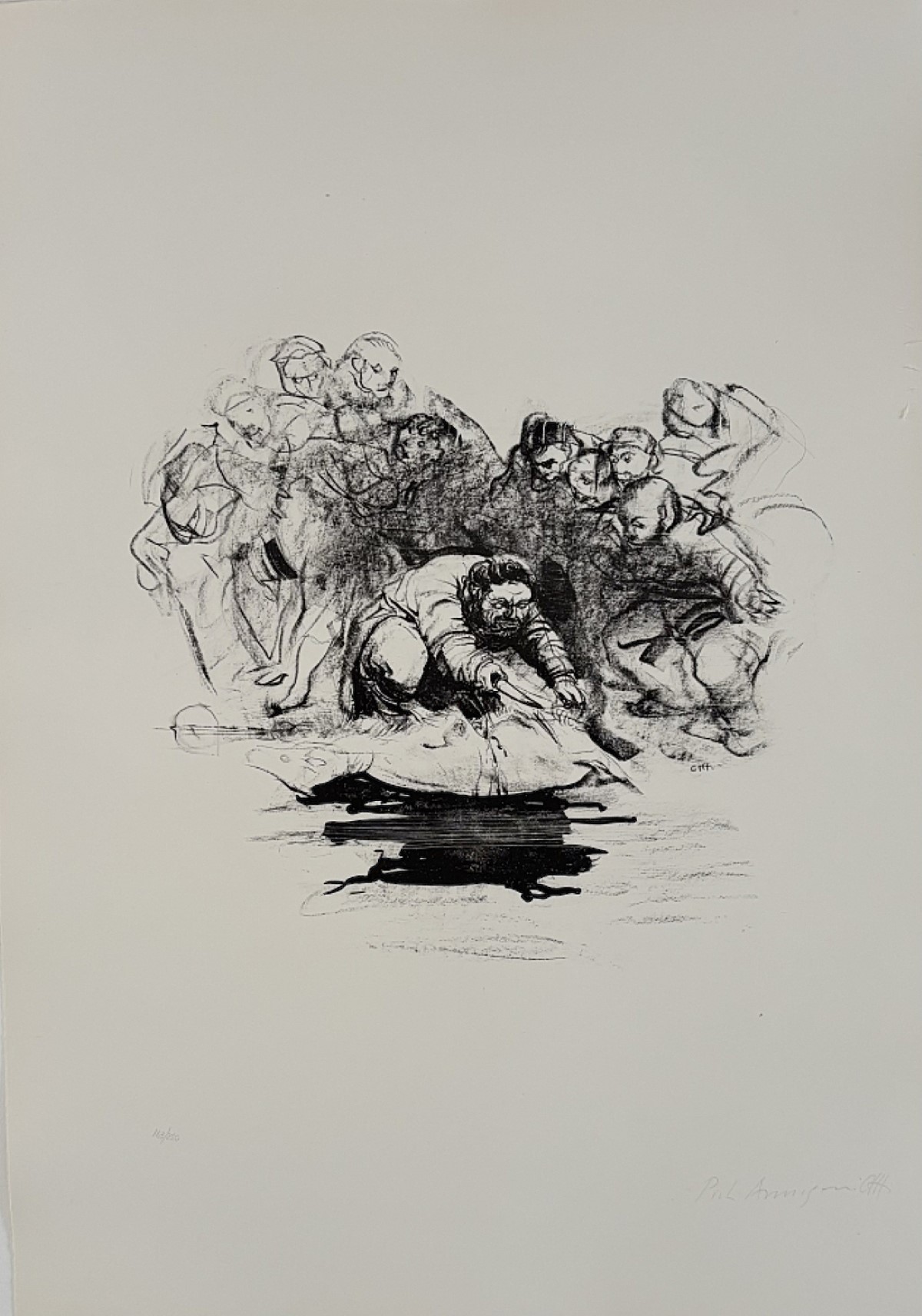 ANNIGONI PIETRO Milano 1910 - Firenze 1988 "Senza titolo" Litografia originale su cartoncino pesante, Edizioni Eldec, cm 50x70 del 1981. Firma e timbro a secco sul fronte in basso a destra, tiratura 163/250 a sinistra. Opera creata per illustrare il libro "La follia di Erasmo da Rotterdam".