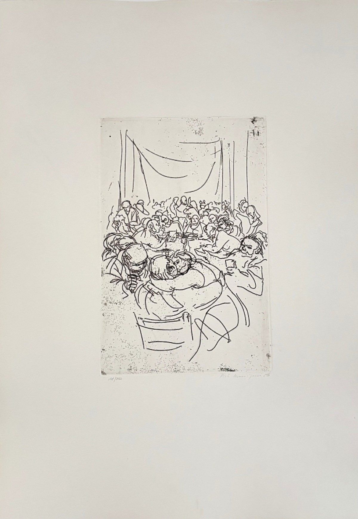 ANNIGONI PIETRO Milano 1910 - Firenze 1988 "Il comizio dei folli" Incisione originale su cartoncino pesante, Edizioni Eldec, cm 50x70 (foglio), cm 23x34 (disegno) del 1981. Firmata sul fronte in basso a destra, tiratura 147/250 a sinistra. Opera creata per illustrare il libro "La follia di Erasmo da Rotterdam".
