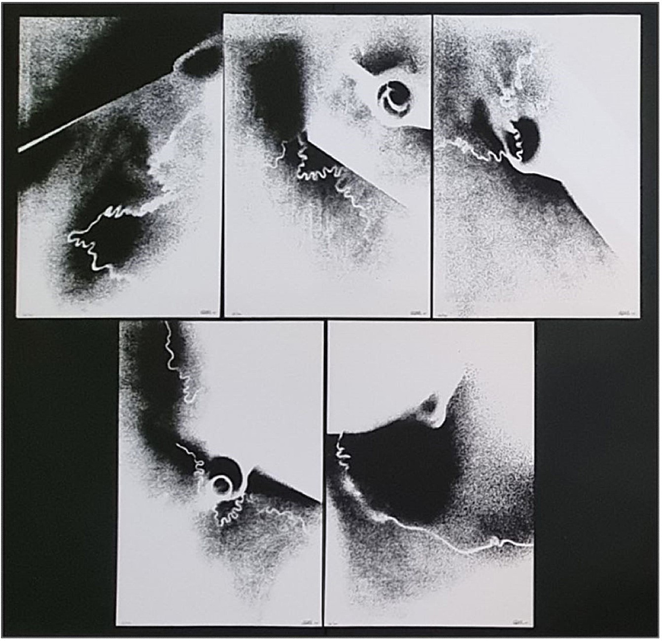 SOBRERO ETTORE Torino 1924 - Milano 2014 "I segni del vento dell'orsa" Cartella contenente n. 5 serigrafie cm 32x47 del 1975. Firma, data e timbro a secco in basso a destra, tiratura 66/100 a sinistra.