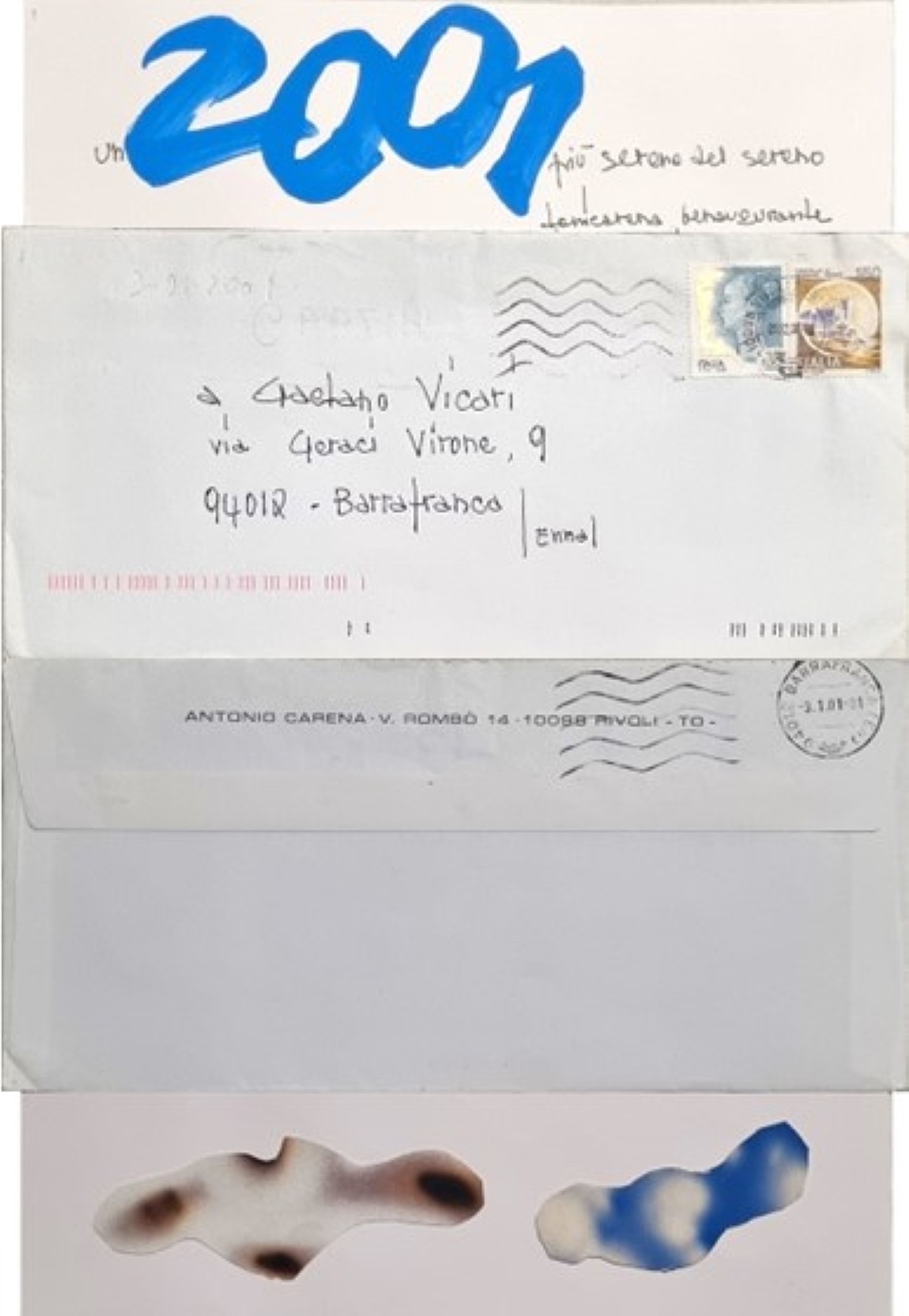 CARENA ANTONIO Rivoli 1925 - 2010 "Senza titolo" Collage su biglietto cm 22x6 del 2001. Firmato e dedicato. Corredato da busta per lettera originale.